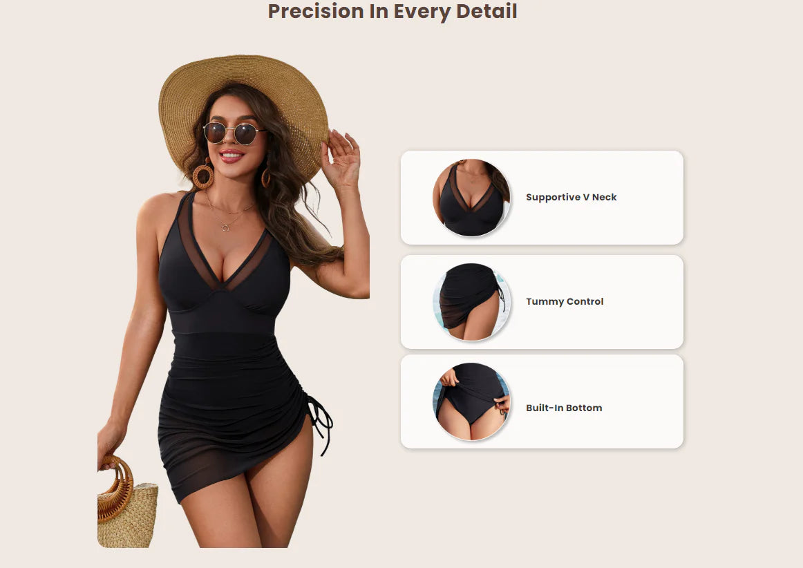 Featuring a mesh see-through V-neck and sarong wrap, this one-piece swim dress offers a chic and sensual look while accentuating your figure with tummy control and pleating details. The swim dress combines modesty with a touch of sexiness.