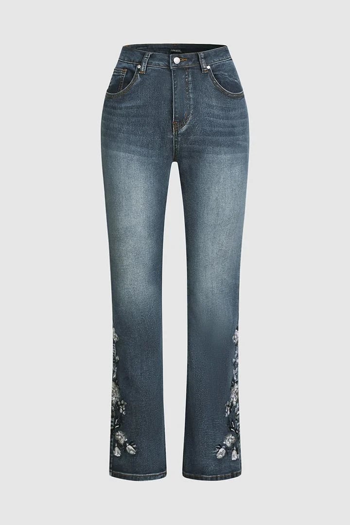 Floral Hand Embroidery Mid Waist Bootcut Jeans