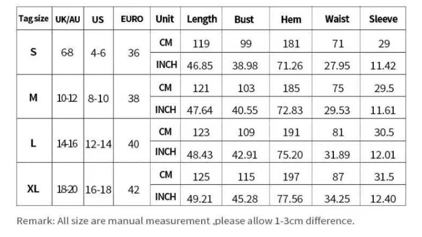 NOTE: All size are manual measurement, please allow 1-3cm difference.