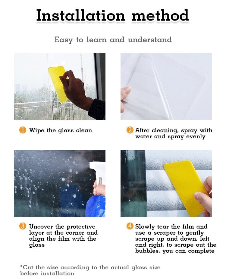 ✅✅【EASY INSTALL】- Wipe the glass clean. After cleaning, spray with water and spray evenly. Uncover the protective layer at the corner and align the film with the glass. Then slowly tear the film and use a scraper to gently scrape up and down, left and right, to scrape out the bubbles. (Installed onto the exterior of the window is OK!)