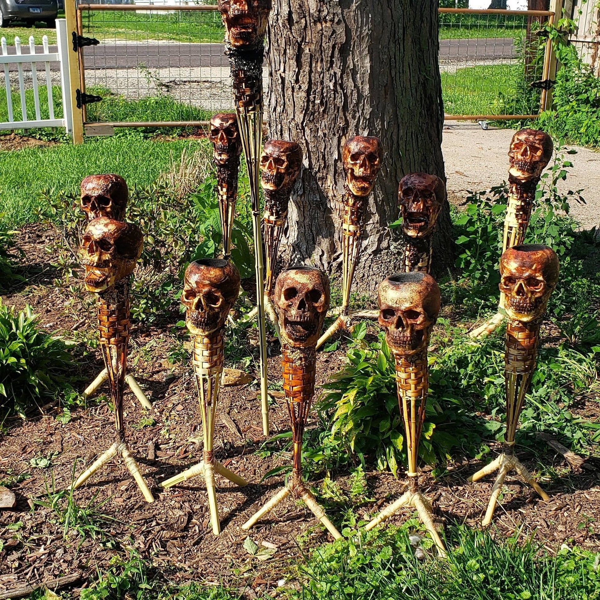 The torches are handmade from bamboo, resin, and plastic human skulls, so they are all unique, andย They are 70cm๏ผ(27ย 9/16ย inches/H)๏ผ tall.