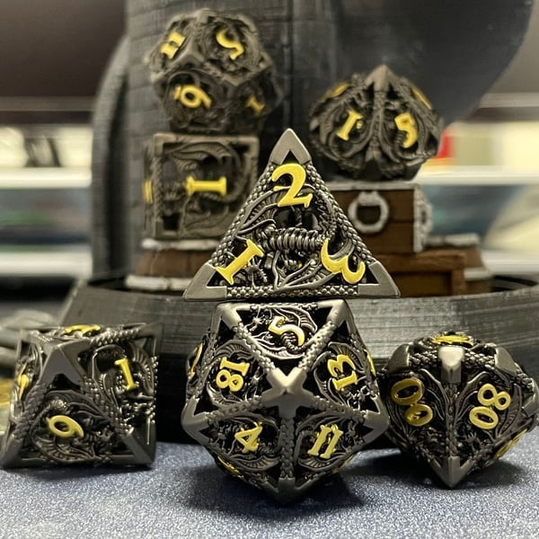 Hollowed metal dice set with the flying dragon. Perfect items for your dnd table game 🐲