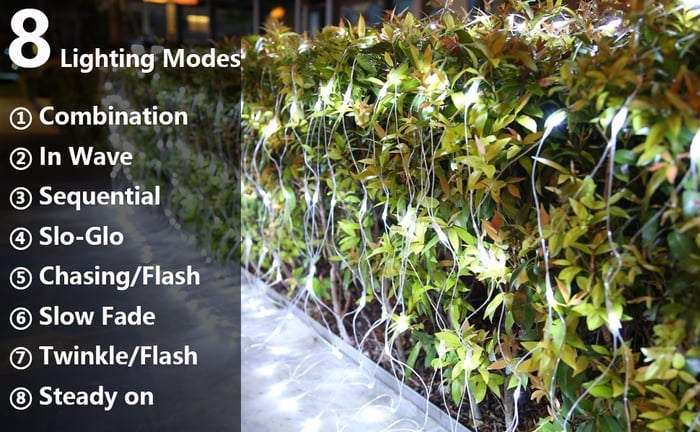 8 Modes : This special light has 8 different modes. Combination, Wave, Sequential, Slo-glo, Chase, Slow Decay, Blinking, and Steady. Our special net light's adaterpter is a built-in memory chip that saves your last mode setting, no need to reset the mode every day.