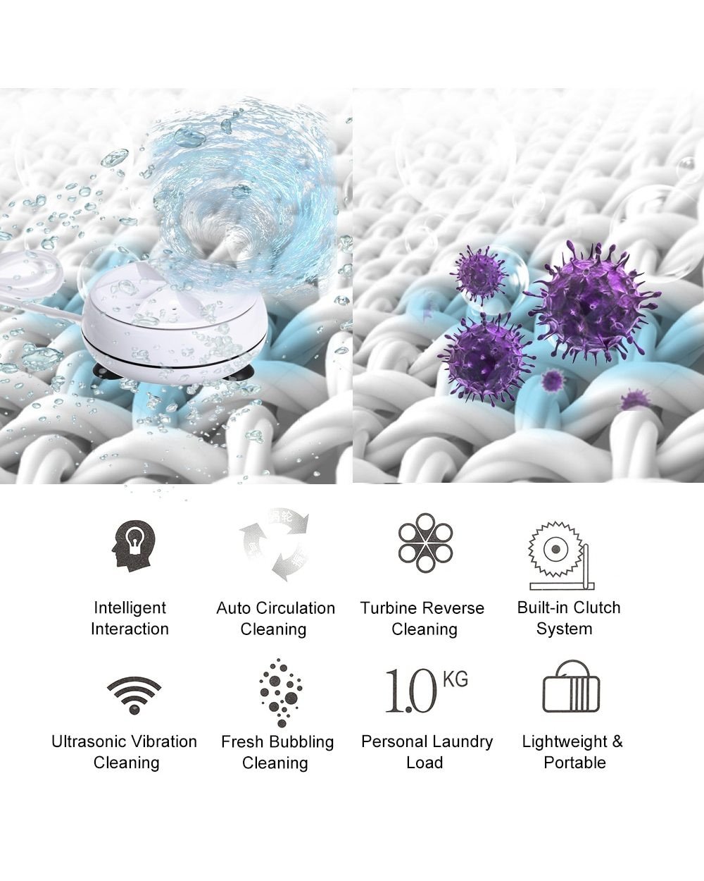 Our Mini Washing Machine is recharges via USB that features bubble spray, 2D flow, immersion cleaning, and ultrasonic waves.