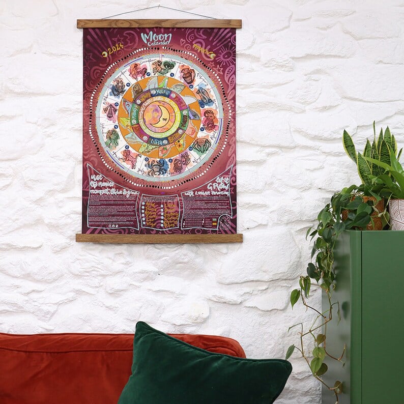 This unique moon phase 2024 calendar features an Art Nouveau aesthetic. Perfect as a gothic home decor gift for your pagan friends and lovers of Greek mythology. This luxurious wall art gift can later be transformed into an art print for lovers of bohemian, maximalist, art nouveau home interiors.