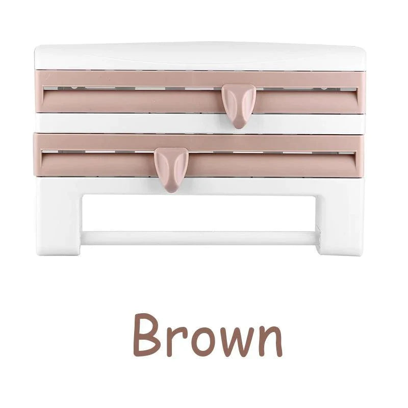 Wall-mounted kitchen roll holder with cling film, storage rack and foil cutter. Convenient and suitable for using to storage cling film in the kitchen