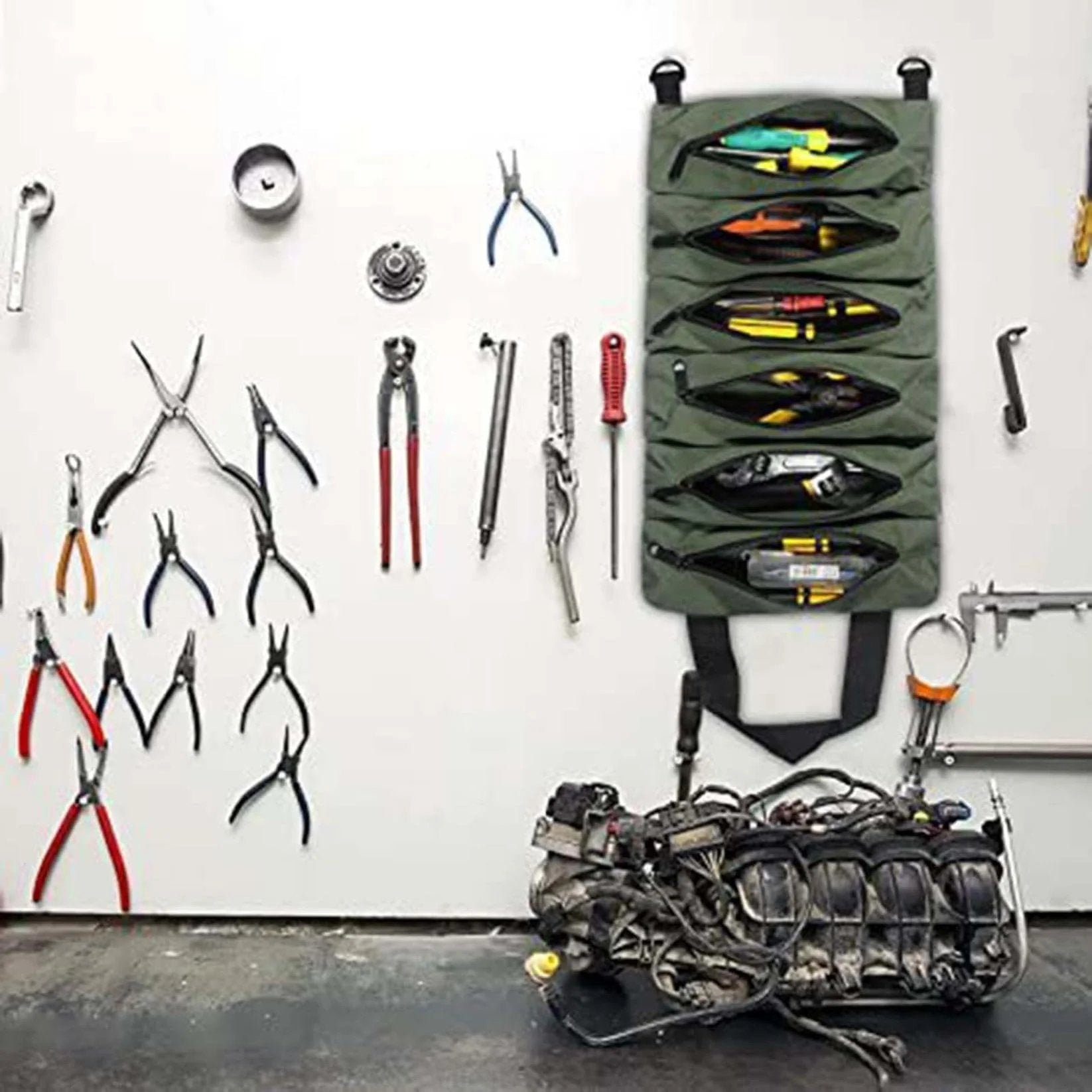 [Large capacity roll up tool bag] The toll roll has 5 spacious zipper pockets that can store all car/motorcycle repairs and spare parts. You will be surprised how many tools can be stored in this zipper tool bag.