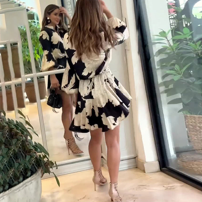 Package Includes: 1 *Printed Cinched Waist Lantern Sleeve Vintage Dress