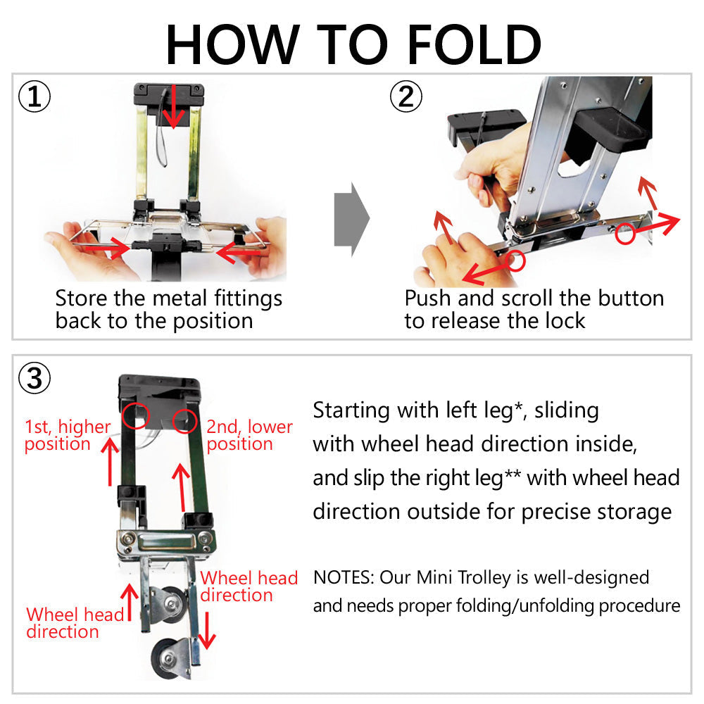 - Business Travel Trolley with 2 wheels is lightweight with just 2Lbs and foldable in compact size, fitting in the backpack and bags, and perfect for office, business, school, shopping *NOTES: When you fold our portable hand truck, please refrain from forcing to store parts, which may influence product durability so just follow the procedure HOW TO FOLD