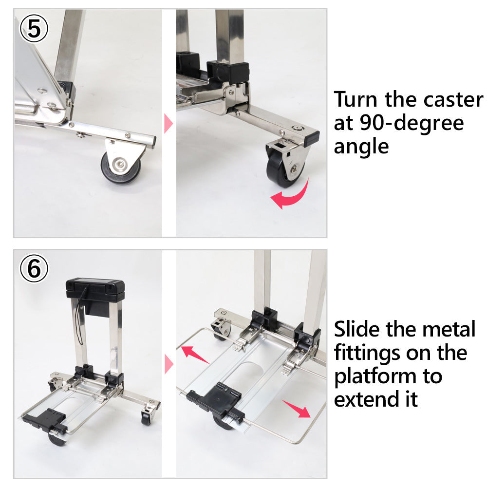 - Collapsible Luggage Carrying Cart Set includes Hand Truck x1, Bungee Cord x1 and metal plate (self-adhesive), needed to transform from 1.5inch-thick book-like body to stylish hand truck by following the procedure on HOW TO USE page for proper assembling method *NOTES: Some parts of fresh product might be screwed tightly; we recommend you to use cotton work gloves for first assembly before use