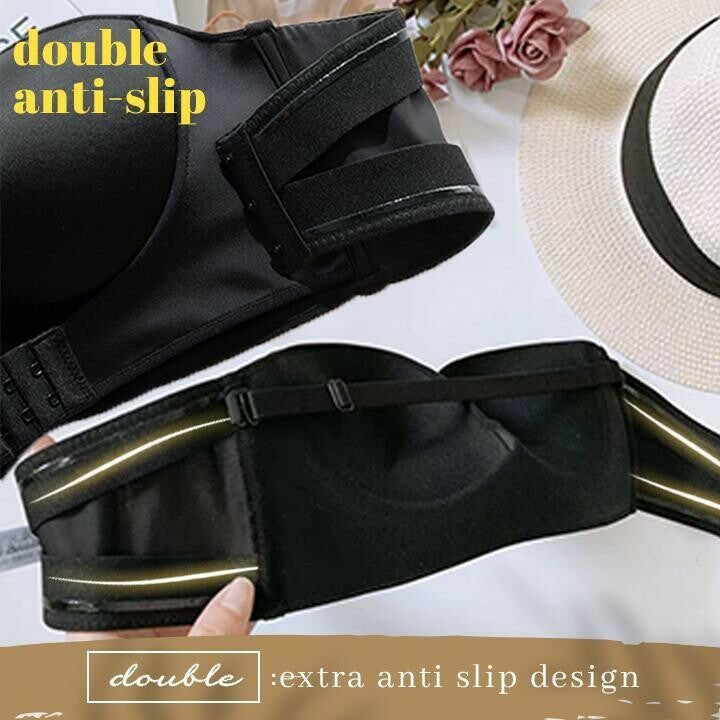This strapless bra lets you wear low-cut, off-shoulder and backless tops and dresses without ruining the look. Its wide wings and secure front and back buckles offer full non-slip support and flattens fatty bulges for a slimmer silhouette. The front buckle also boosts your cleavage while reducing bounce.