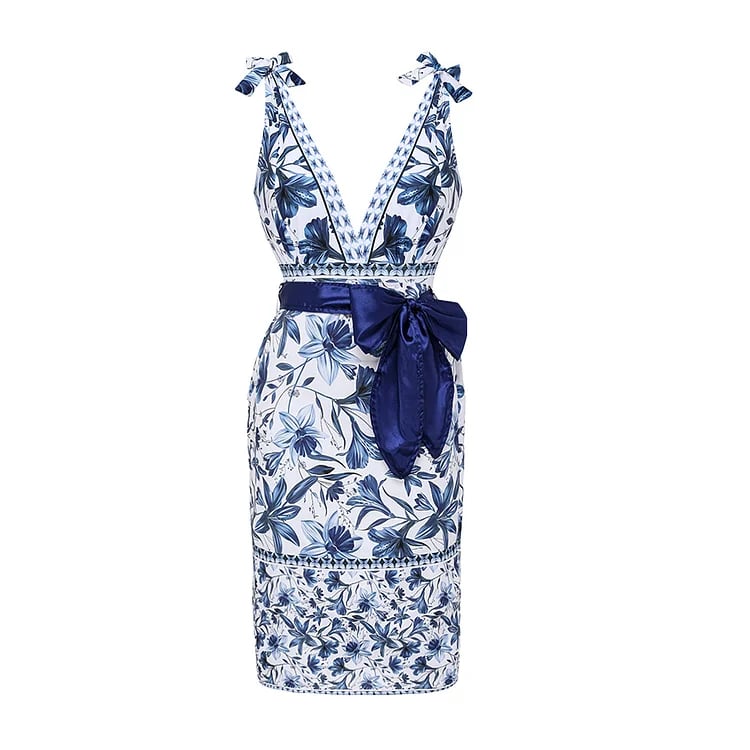 V Neck Lace Up Strip Plant Prints One Piece Swimsuit and Skirt/Sarong