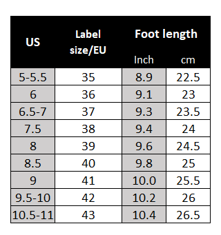 Note: The width(narrows) can be chosen one size larger to maintain the shoe fit.